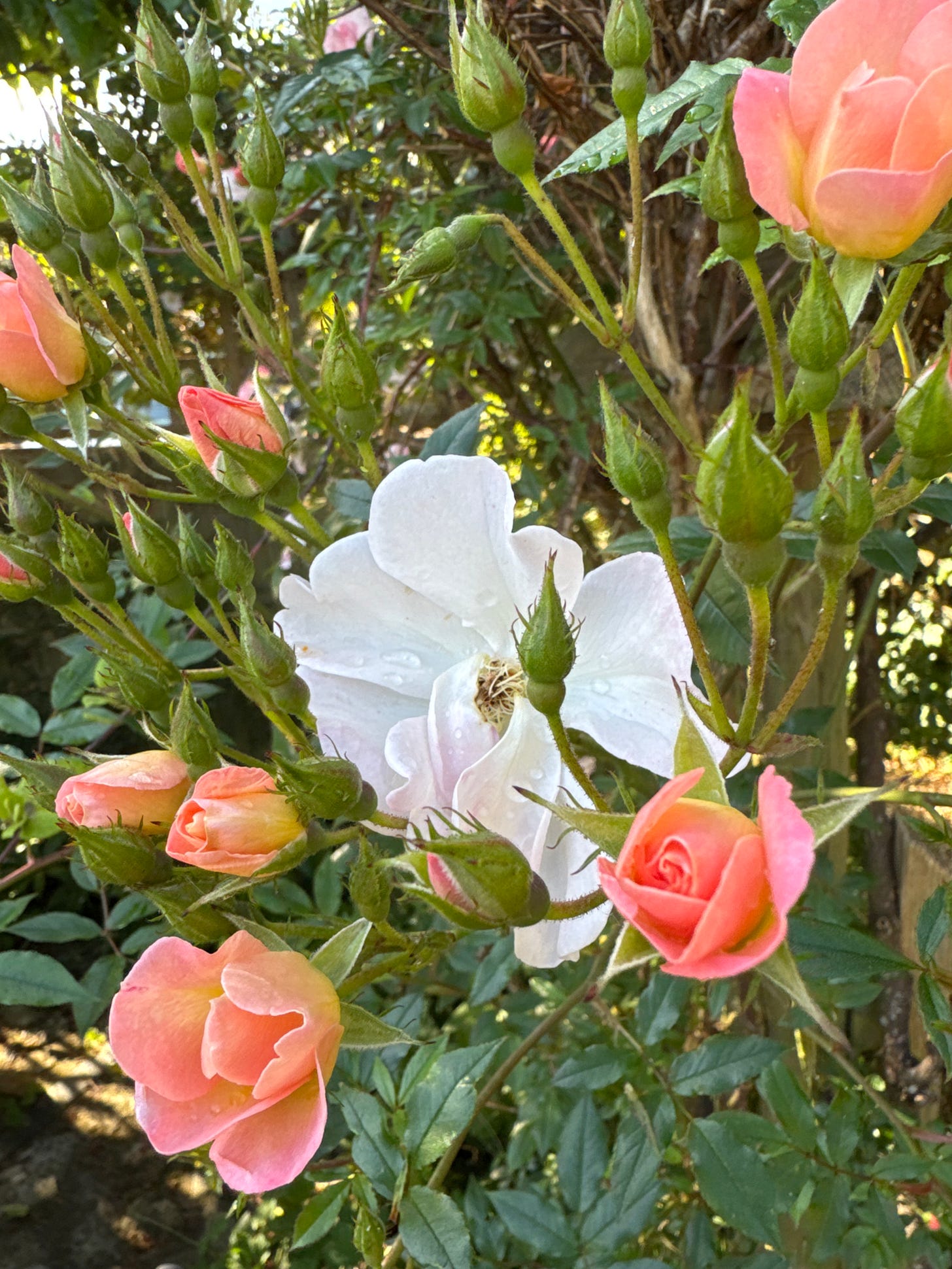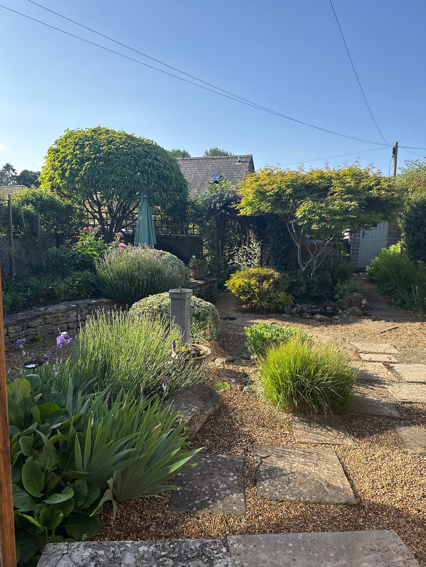 Monday morning and the garden is rain fresh … I stand in it, listening, and feel the disarming beauty filter into my body. Ray by sun ray, breeze by breeze, bird sound by song by sound. It’s early. I mistook 6.30 am for 7.30 when I woke up today and it makes an unmistakable difference to how the world feels. A wood pigeon calls from the fence, low and guttural. On repeat. Rooks caw from the field, but mostly it’s quiet. A still sleeping sound…. Light is bright and soft, an emerging light entering into everything, not yet warm. The garden is very cool, I need a cardi (there is one permanently kept draped over the chair in our kitchen) and that extra small delight of cradling a hot cup of tea adds to the inordinate pleasure I feel in this moment, now.